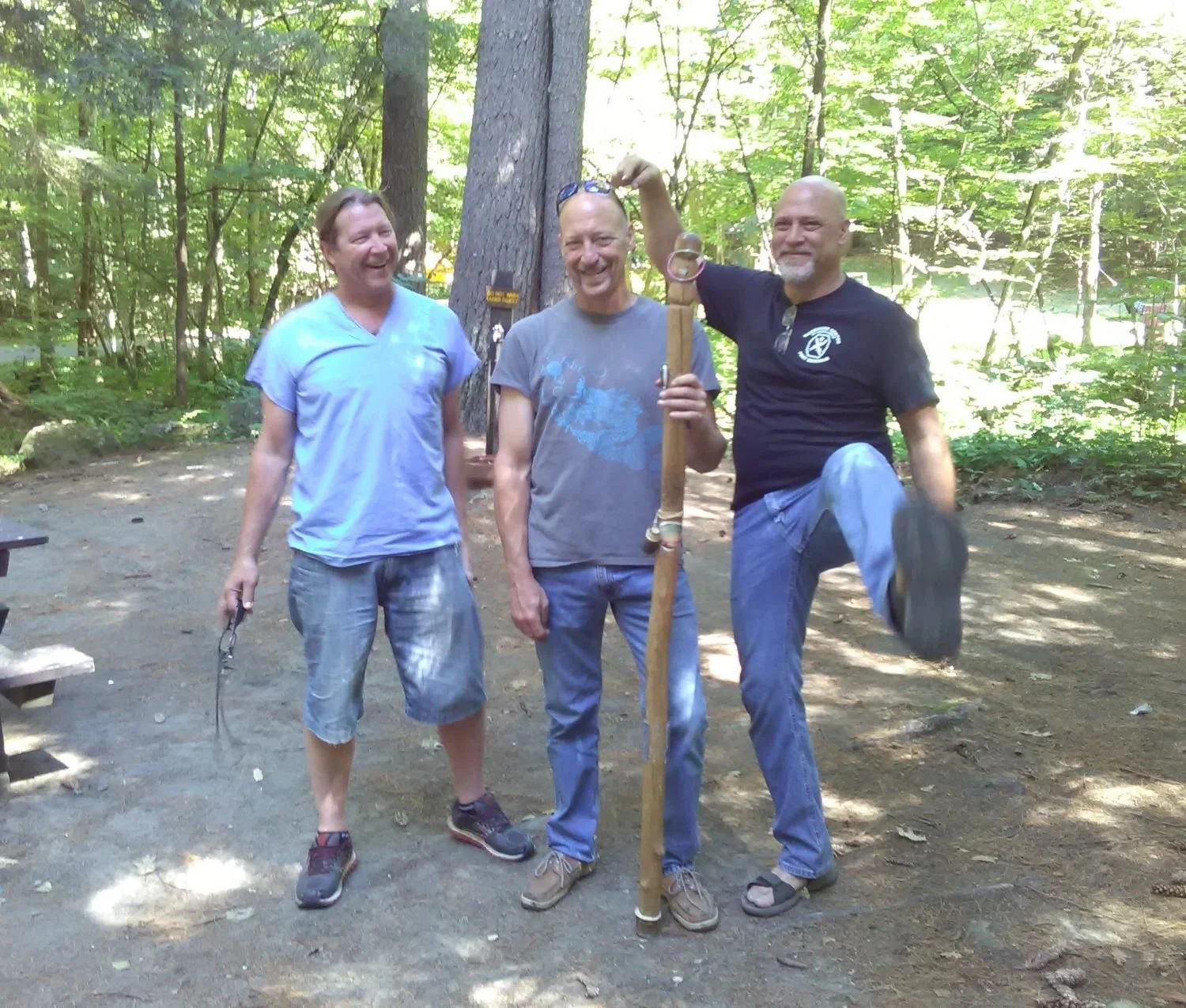 The three caballeros: Matt, John, and Ralph. The handing off of the staff occurs on the last morning before we leave to go home. The staff is a piece of history of our camping trips. It has a carving or an object that symbolizes each trip. The person who receives the staff picks where we’re going next year, and so on.