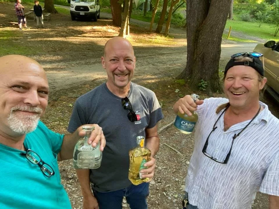 From left to right, Ralph, John, and Matt enjoy “twacks” of tequila on the first night of camping in 2019.
